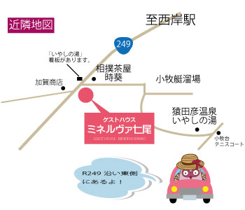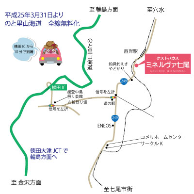 | 大阪方面から | 名神・北陸自動車道・のと里山海道横田ICから国道249号線 約4時間40分 |